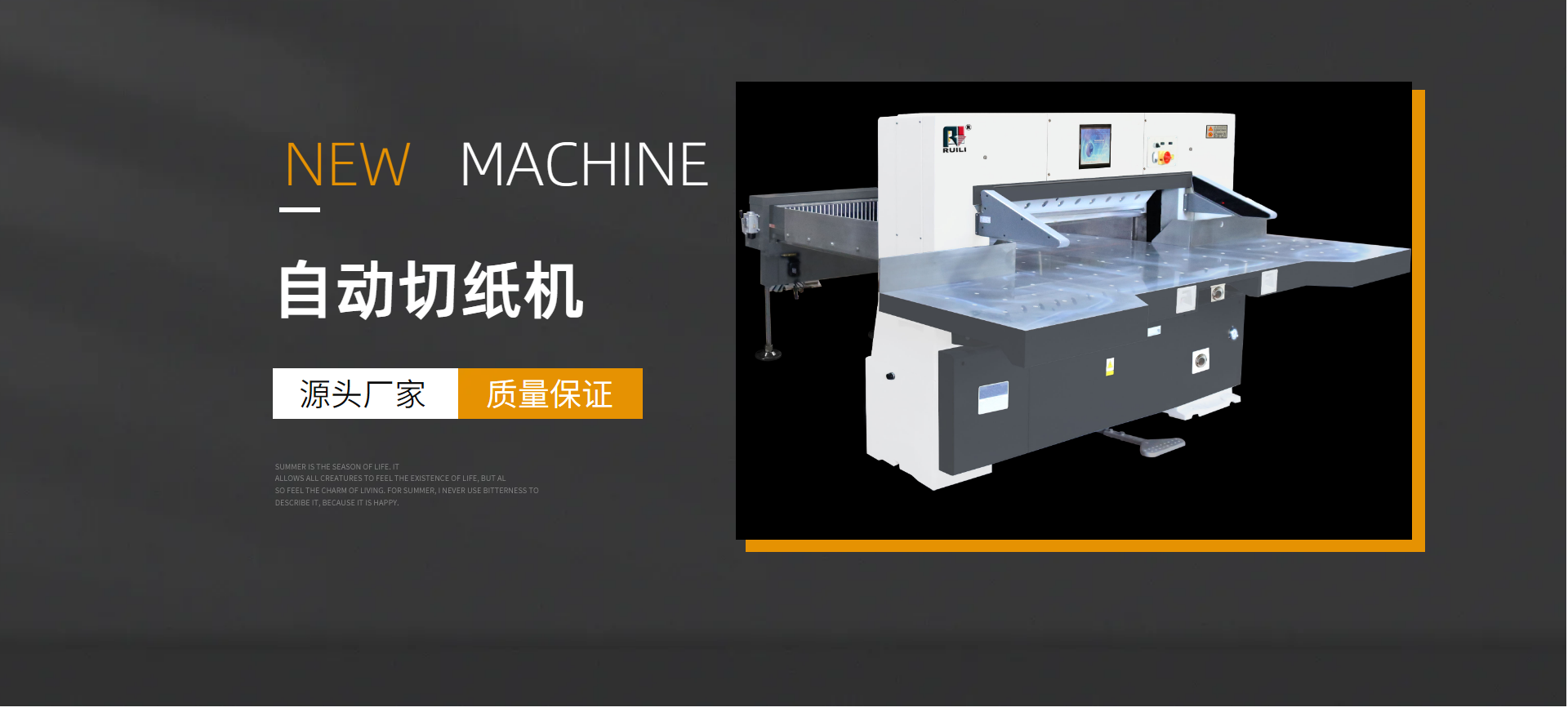 瑞安市瑞勝機械有限公司是一家專業集“生產、銷售、服務”于一體的印刷包裝機械企業;有二十余年專業制造切紙機的經驗,在切紙機行業中享有較高聲譽。研制出集光、機電、液為一體的高性能高品質的切紙機系列產品,主要產品有電腦切紙機,雙液壓電腦切紙機,雙導軌數顯切紙機,快捷式壓痕機系列,覆膜機、上光機、燙金機等系列產品。